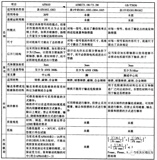 為便于API610(僅指懸臂式泵)、GB/T5656(參照ISO5199)、ANSIB73.1M/B73.2M標(biāo)準(zhǔn)進(jìn)行比較,將其相關(guān)欄目的內(nèi)容以表格的形式列出。