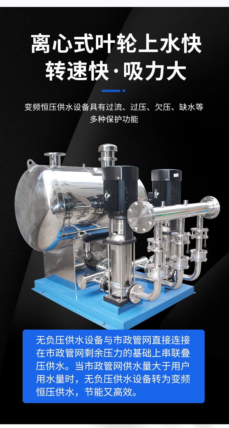 保護(hù)功能全:主機(jī)采用的進(jìn)口變頻調(diào)速器自身具備多種強(qiáng)大的保護(hù)功能,如欠壓、過壓、過流、過載、短路、過熱、失速防止等,其無故障運(yùn)用時(shí)間可達(dá) 10 萬(wàn)小時(shí)以上。此外,設(shè)備的配電控制部分采用智能化控制原理,操作方便實(shí)用,設(shè)備工作狀況一目了然,便于非專業(yè)人員快速熟悉和掌握。即使在設(shè)備出現(xiàn)局部故障時(shí),也能啟用應(yīng)急功能繼續(xù)供水,保障用戶的基本用水需求,大大提高了供水系統(tǒng)的可靠性和穩(wěn)定性。